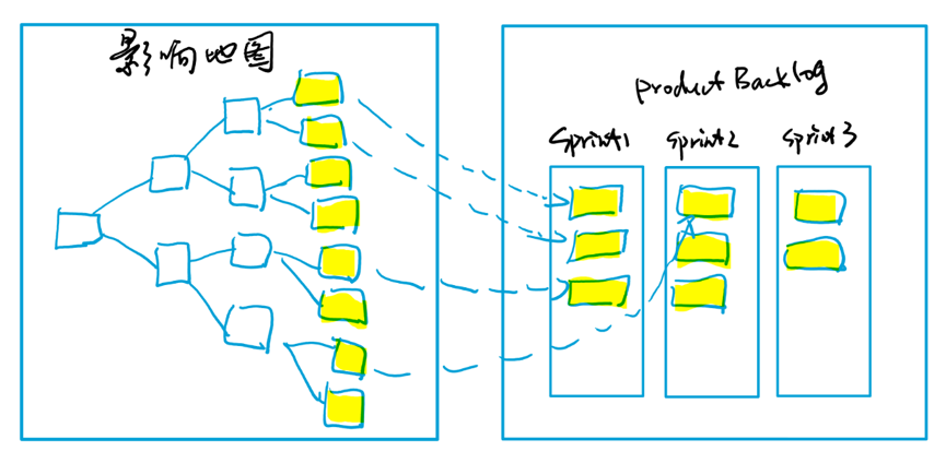 通常,我们通过影响地图这个工具,从业务目标(Why)引出具体需要开发的产品特性(What),如下图左侧部分,其中黄色的卡片代表的是What,我们根据这些卡片的价值高低进行优先级排序,然后把他们引用到到产品Backlog看板,并且规划到相应的迭代中。