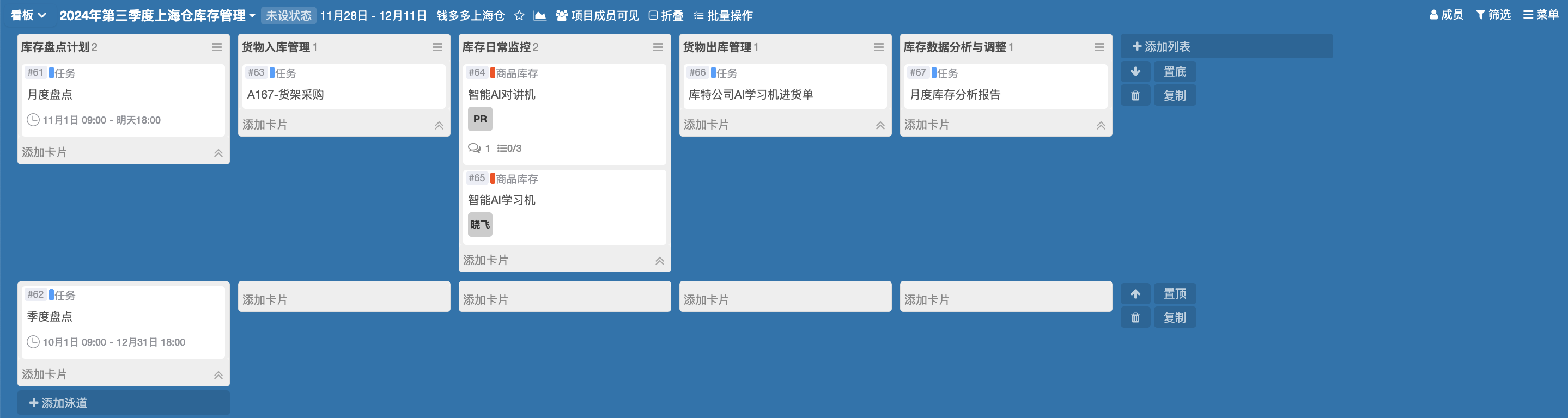 - 不同地方的盘点人员能一起协作。发现差异就在卡片评论区商量,负责人看看板就知道进度,能协调好工作。